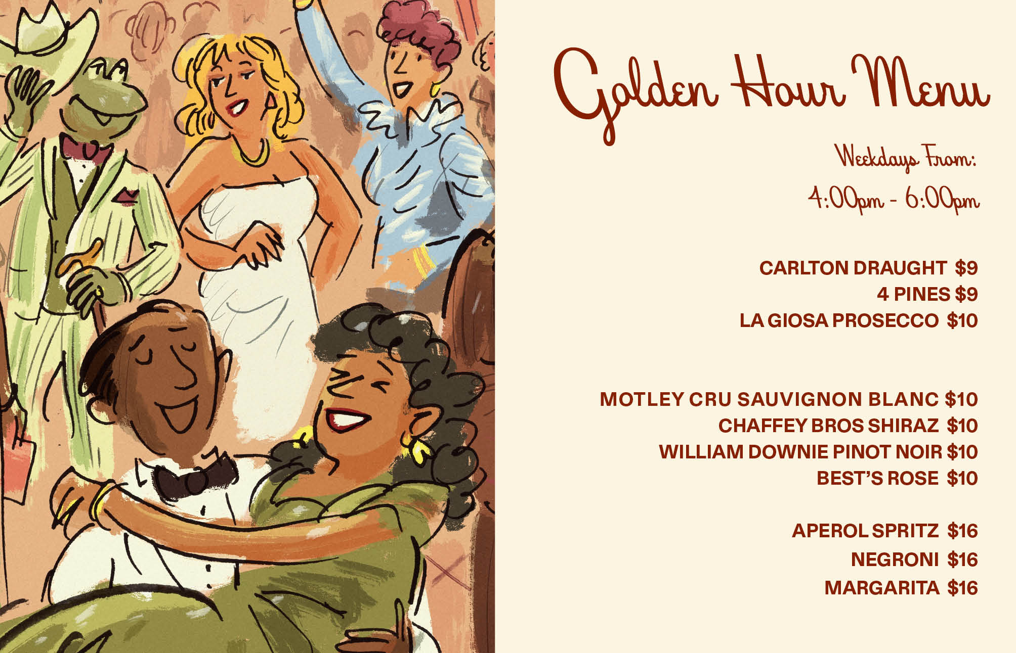 Weekdays From 4-6PM The best part of your day starts here. Pull up a stool, shake off the afternoon, and let us pour you something good. Draught beer, carefully chosen wines, and the classics done right.Definitely where you want to be when the clock strikes 4.
