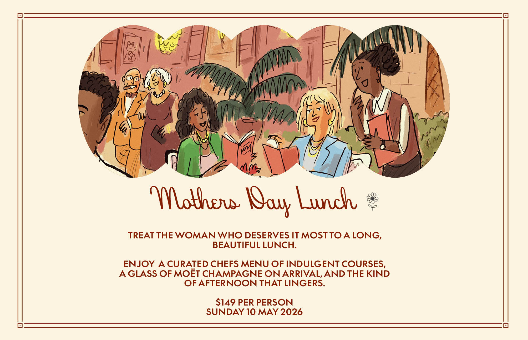 Books are open for Mothers Day lunch. We'd love to have you and yours join us. Our set menu has been thoughtfully put together to celebrate the occasion, think beautiful food, warm company, and a glass of Moët Champagne to start things off right.
